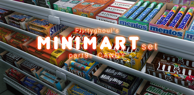Happy Friday Everyone! Only 3 more sets left for the large Minimart set! Today I bring you a bunch of confectionaries. Now your sweet tooth sims can have their candies in their games! I also made a new shelf to display all your candies in your corner stores! Enjoy!! <3